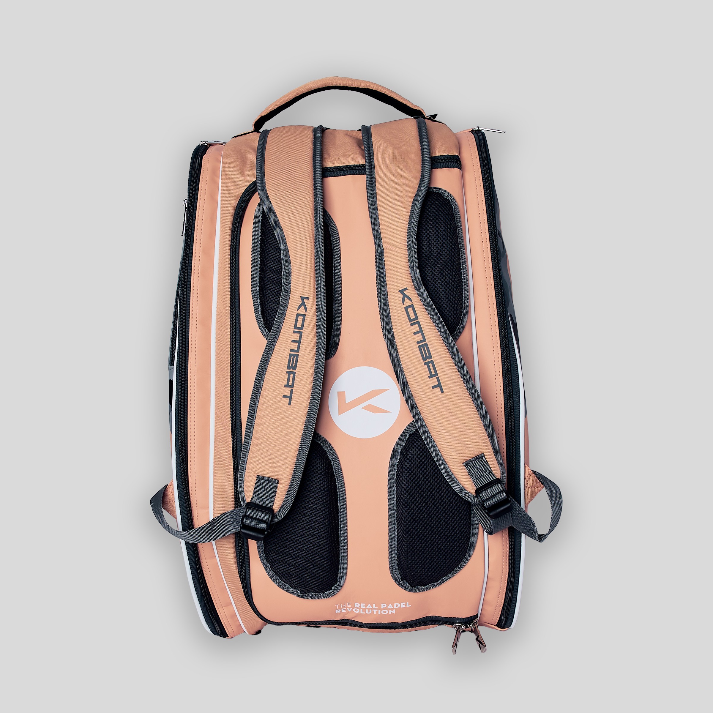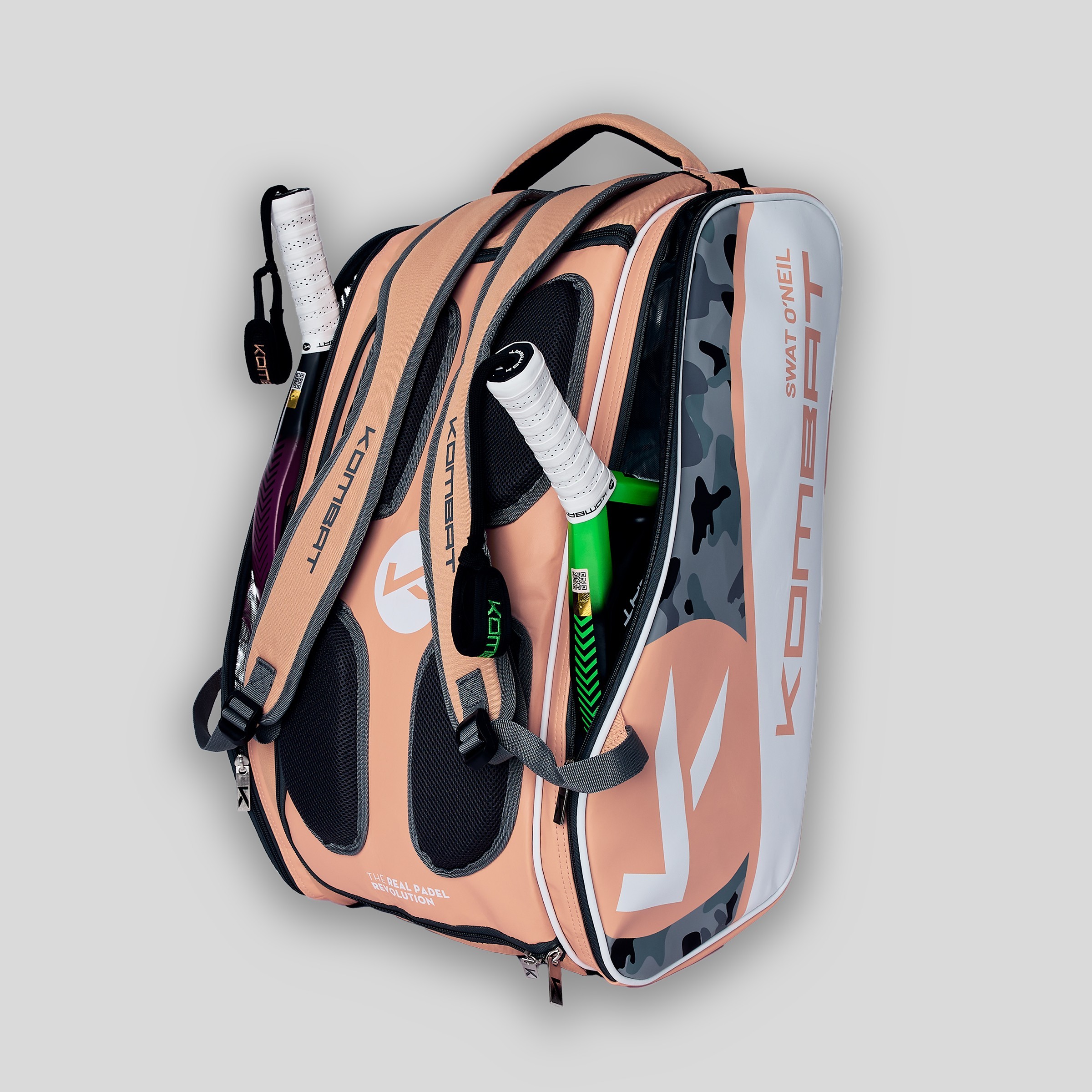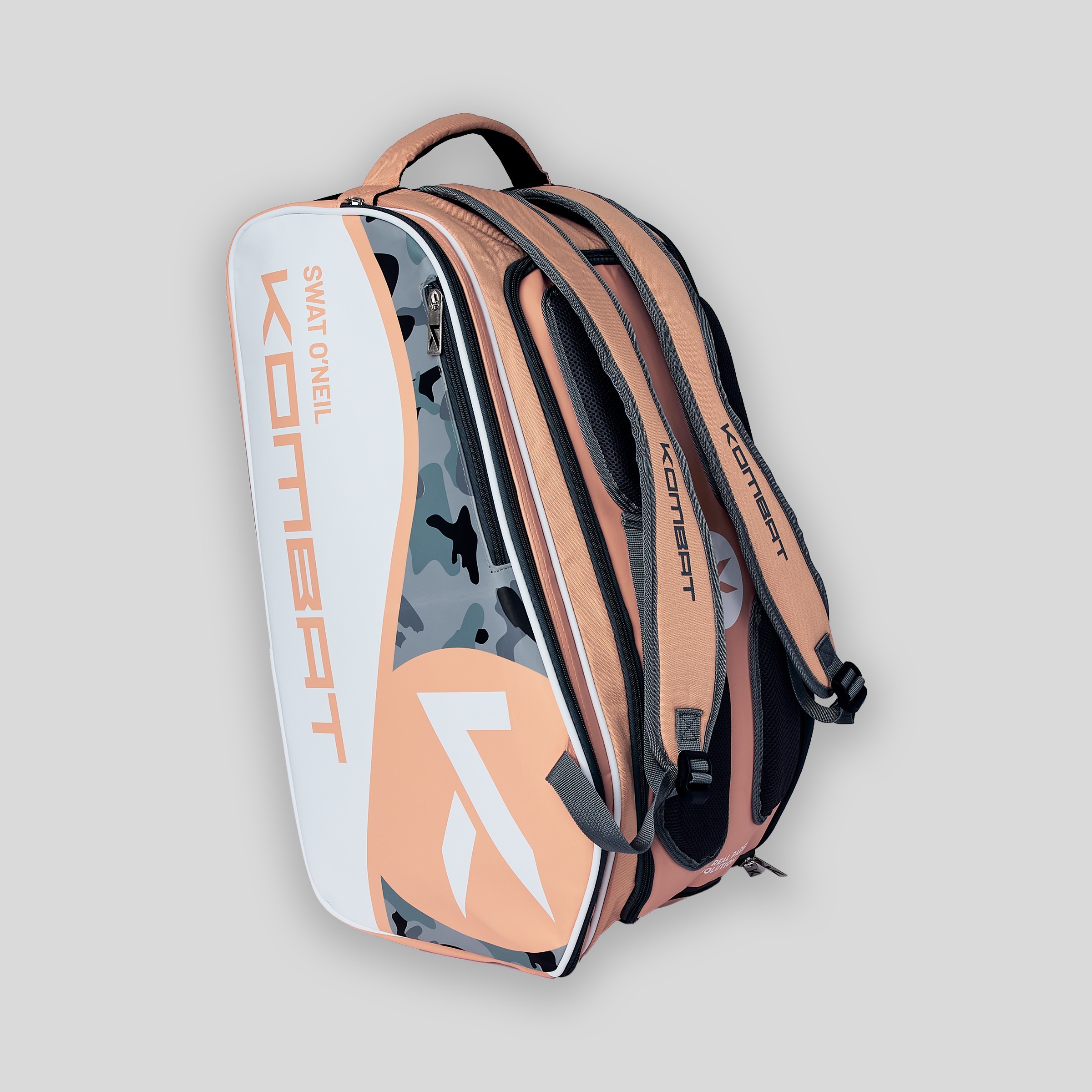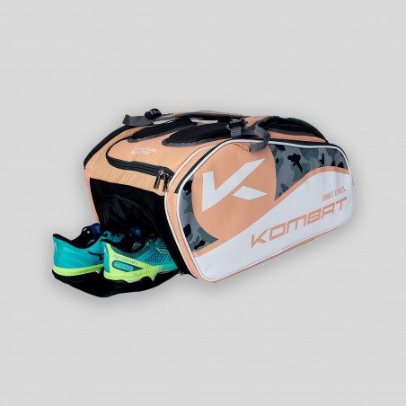 Til je padeluitrusting naar een hoger niveau met de Kombat Swat O'Neil professionele padelracket tas – speciaal ontworpen voor spelers die comfort, ruimte en kwaliteit eisen. Deze zalmkleurige padeltas met elegante witte en grijze accenten is de ideale metgezel voor je Kombat padelrackets en accessoires.